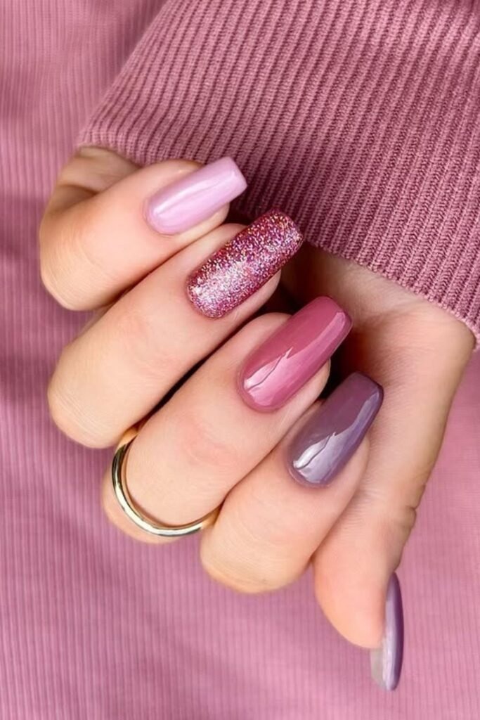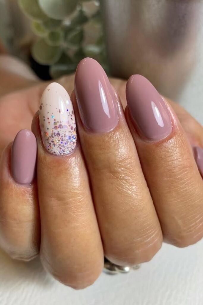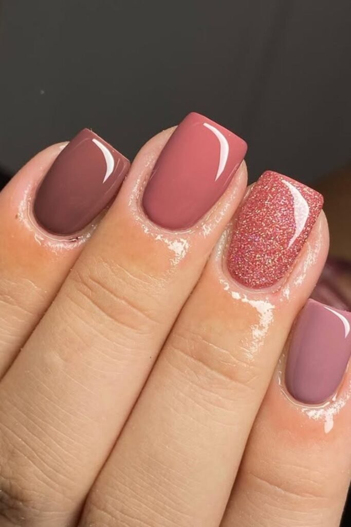 A mauve glitter mix adds sparkle without going overboard. The base stays mauve, while fine glitter is layered on top or used on one or two nails.