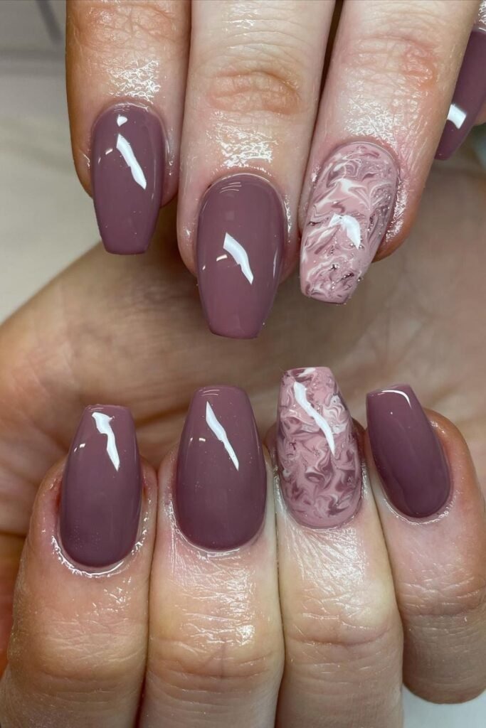 A mauve marble accent nail keeps things balanced. Most nails stay solid mauve, while one nail shows a marble design.