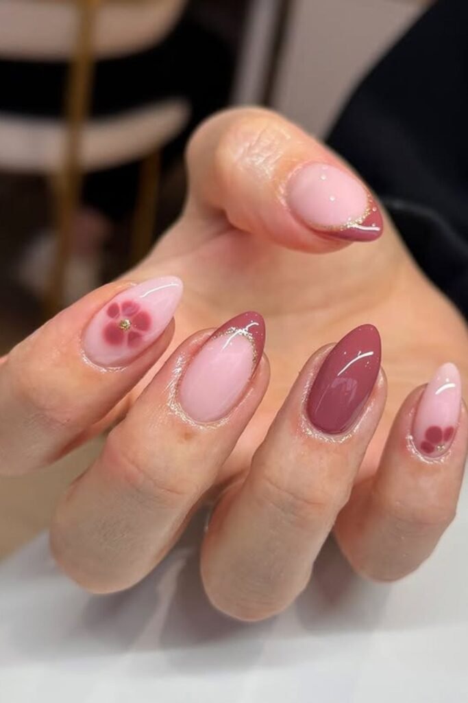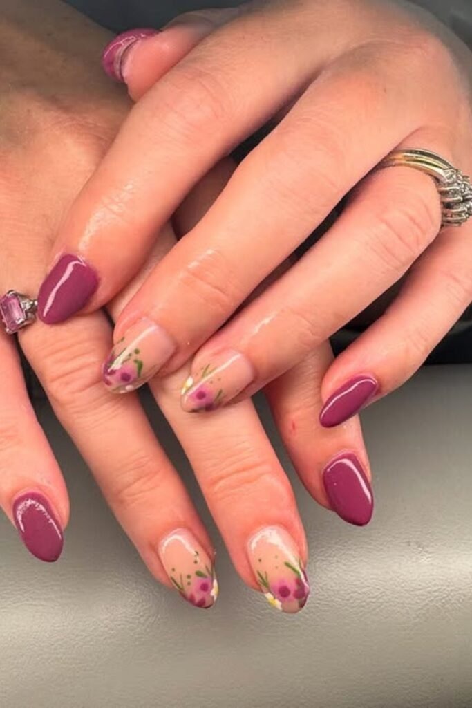Floral mauve tips combine soft flowers with a mauve base. The flowers should stay small and simple.