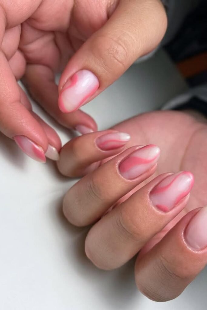 Sheer swirl mauve nails use a light mauve base with soft swirl lines. The sheer layer keeps the look airy.