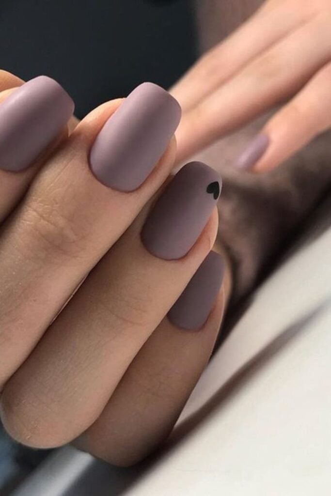 Matte mauve heart nails use a soft matte finish with simple heart shapes. The matte texture keeps it calm.