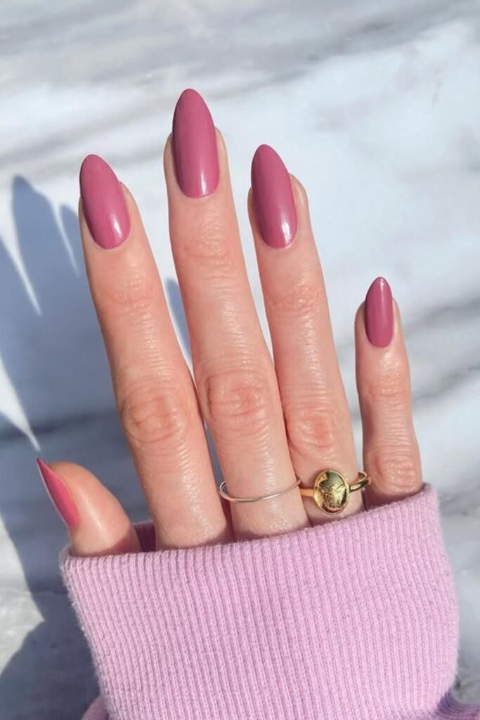 Soft almond mauve nails are simple and clean. The almond shape helps the fingers look longer, while the mauve shade keeps the look calm. This style works well for work, events, and everyday wear.
