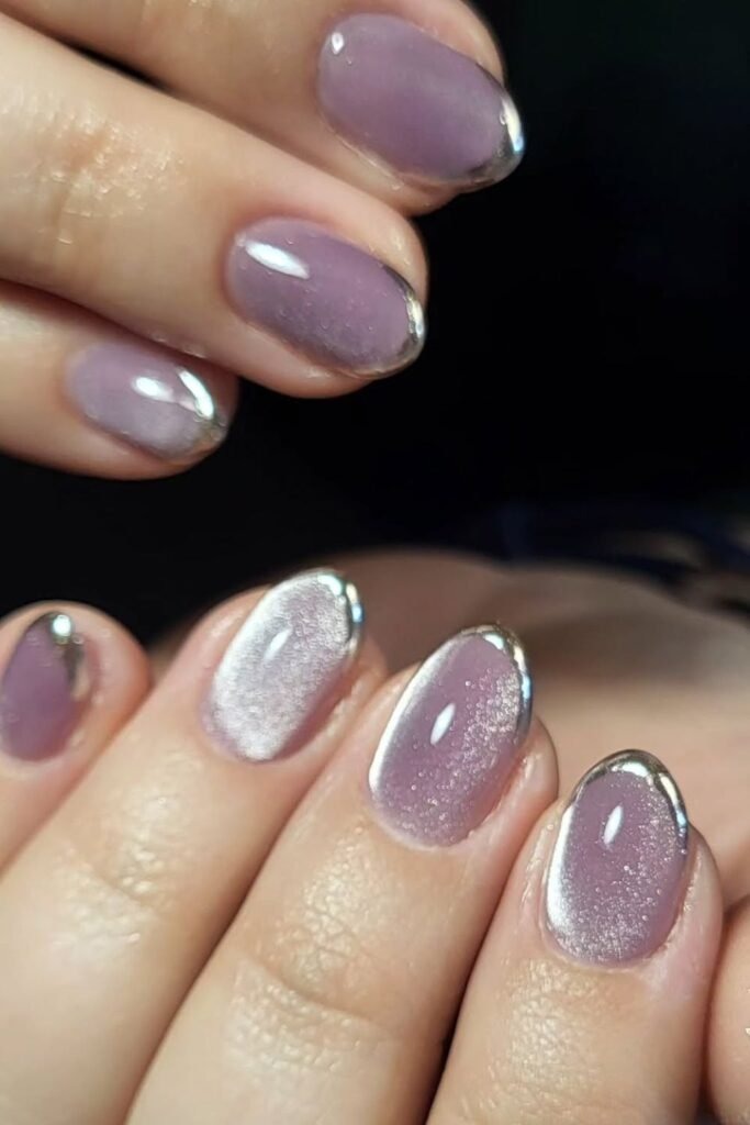 Chrome edge mauve nails add chrome only to the edges or tips. The base stays soft mauve.