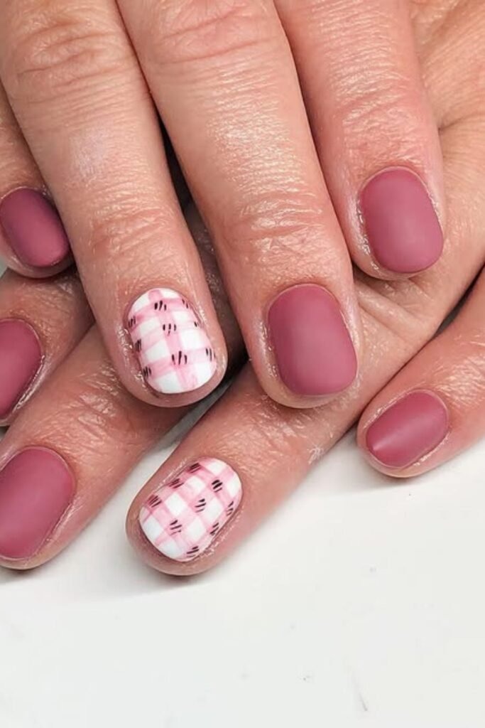 Matte plaid mauve nails use thin lines to create a plaid pattern. The matte finish keeps the design calm.