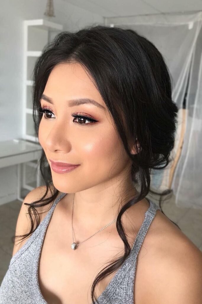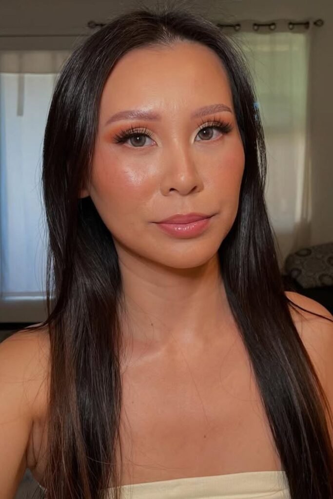 Bronze, peach, rose, warm brown, and champagne shades make Asian eyes pop beautifully. These tones add warmth and depth without closing the eye. For evening, deep brown or plum can add stronger contrast while still keeping balance.