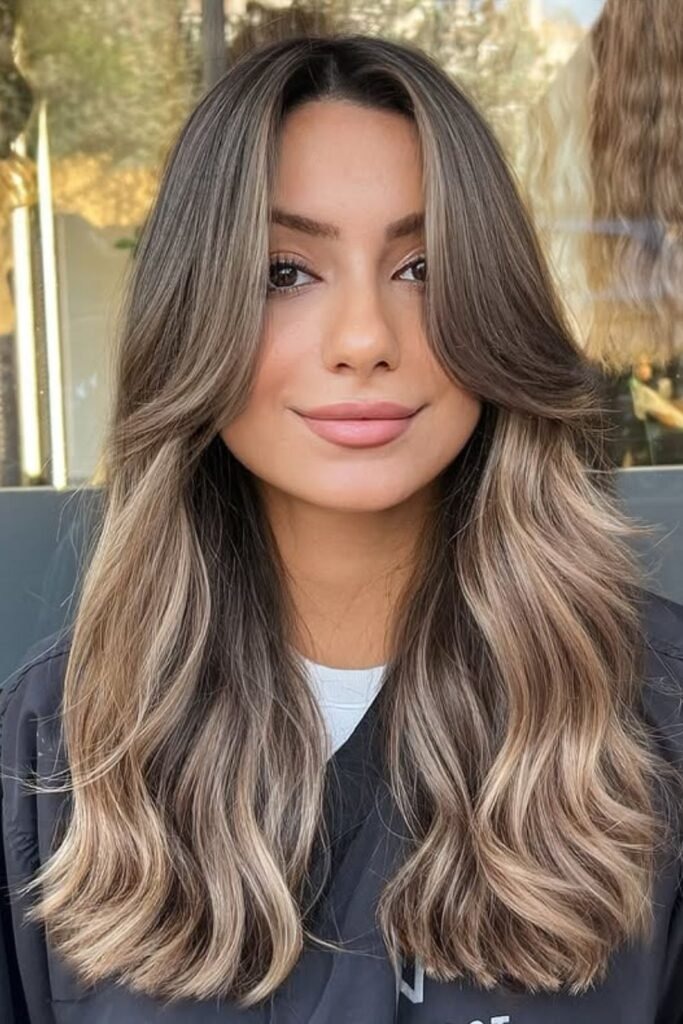 Cool mushroom balayage mixes ash brown and gray-beige tones. It gives dark hair a muted, stylish look. This is a top choice for people who prefer cool tones and minimal warmth.