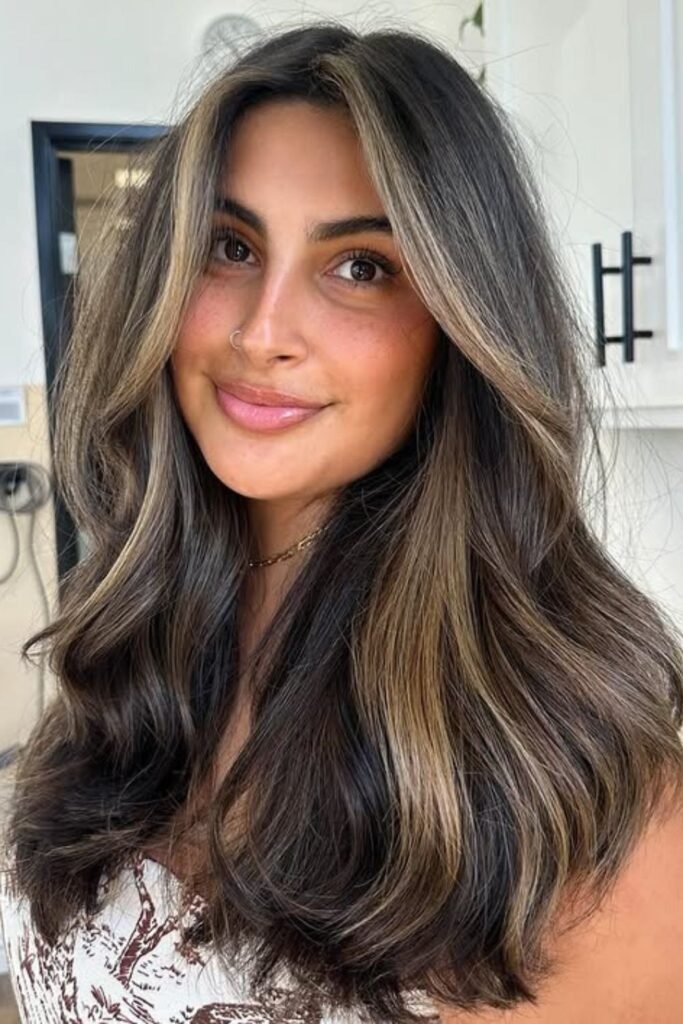 Framing ash balayage strips add cool brightness around the face. The rest of the hair stays deep. It creates structure without heaviness.