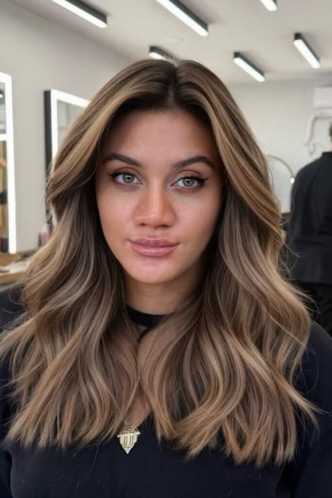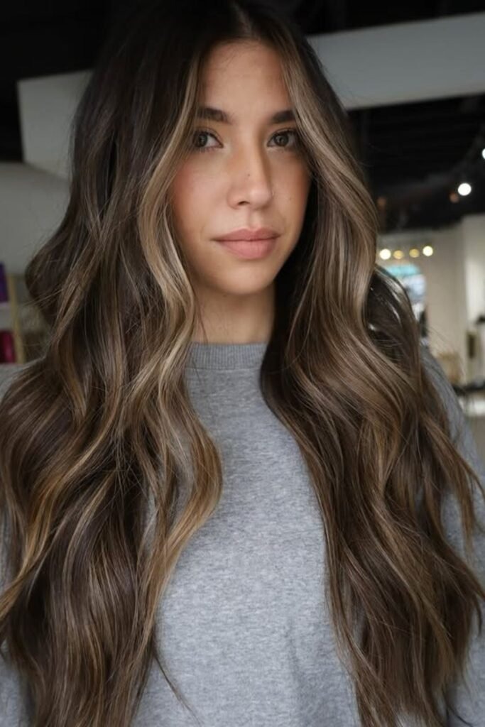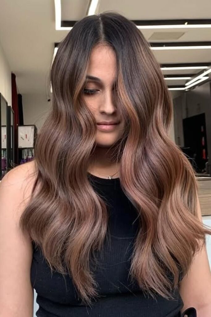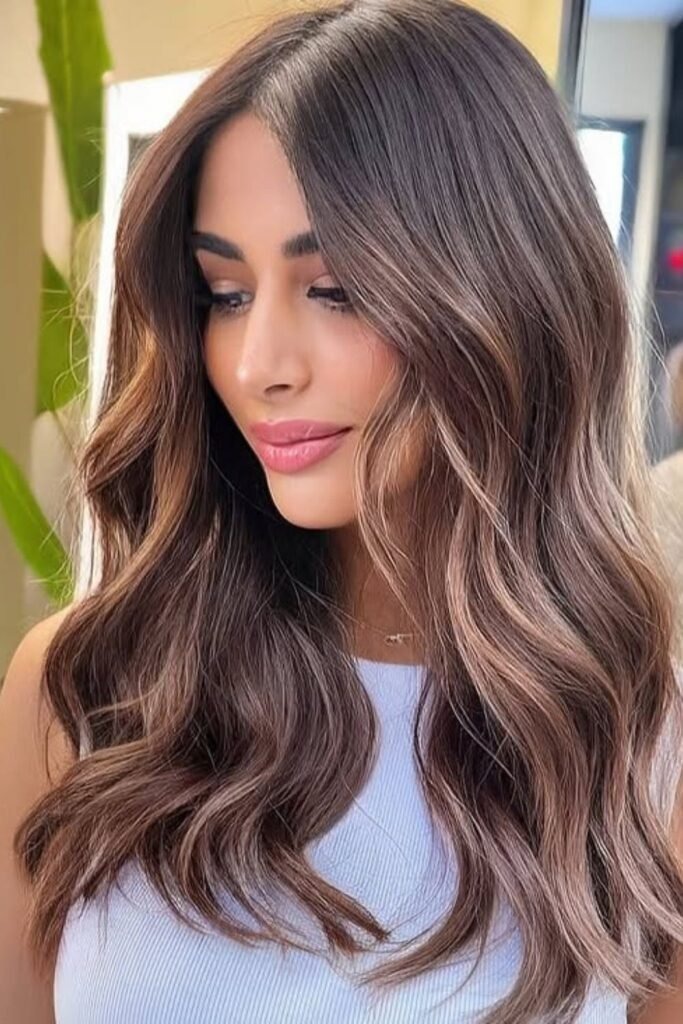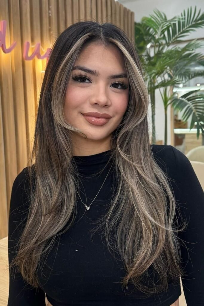 This style focuses on flow and shine rather than contrast. Dark hair looks smoother and healthier with gentle highlights.