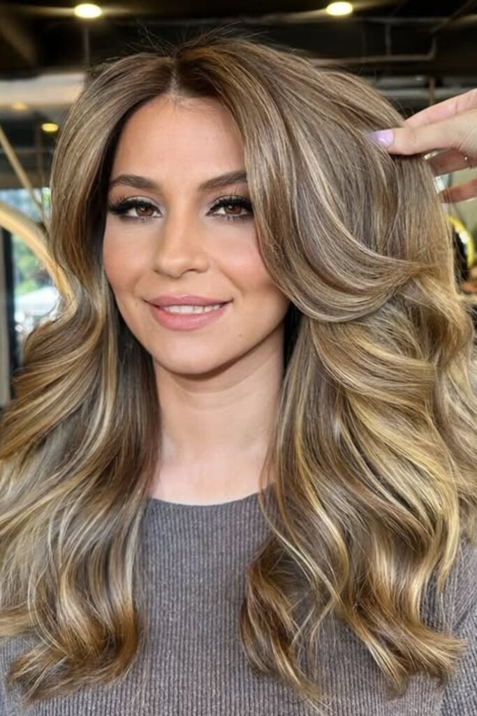 Lived-in bronde waves mix brown and blonde softly. The waves show off the blend, making dark hair look light and relaxed.