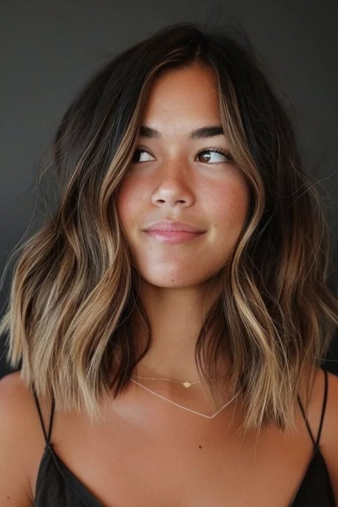 Caramel tones around the face add warmth and softness. This balayage style brightens dark hair without overpowering it. It is especially flattering on warm skin tones. The result is natural, smooth, and easy to maintain.