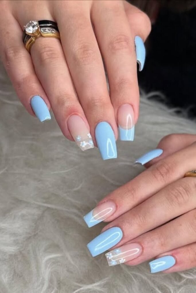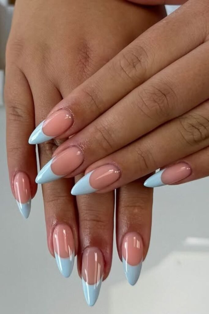 Soft blue French nails are a quiet update to the classic look. Instead of white tips, a light blue shade is used. The base stays sheer or milky, which keeps the nails clean and fresh. This style feels neat and polished without being boring.