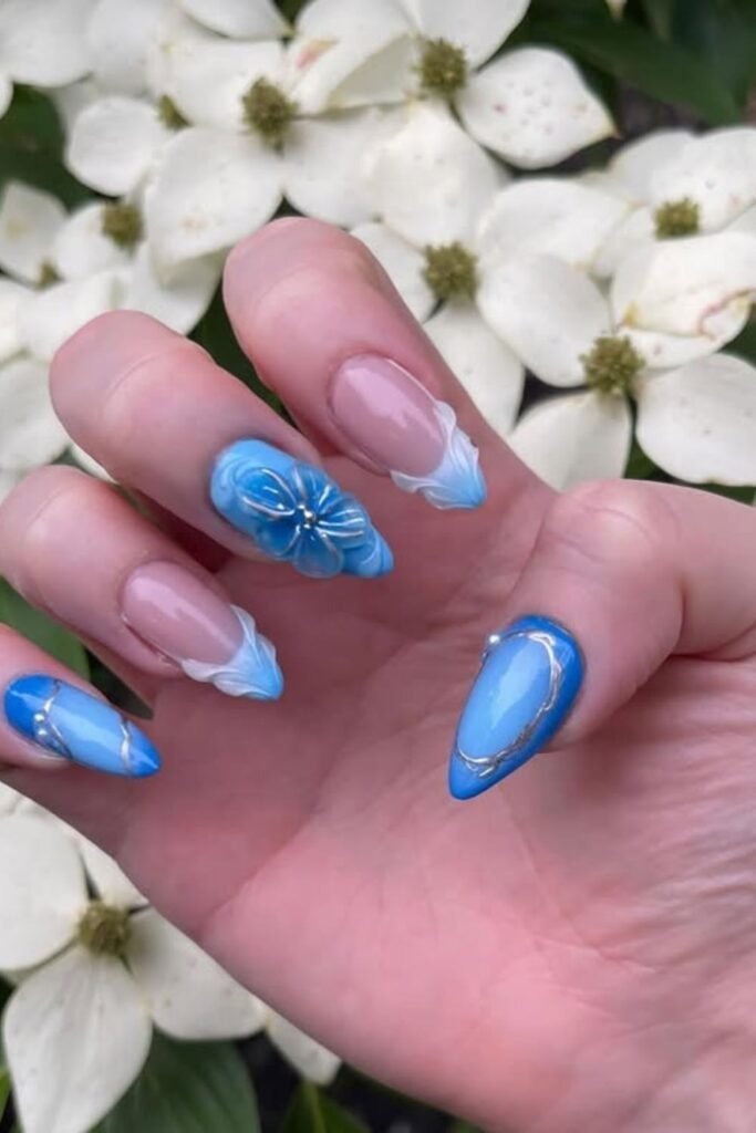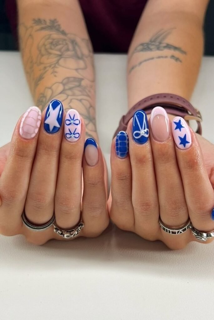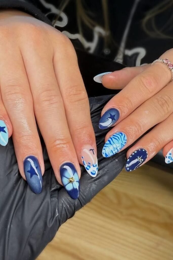 Mixed blue art nails combine different blue designs in one set. Some nails stay solid, others have lines or blends.