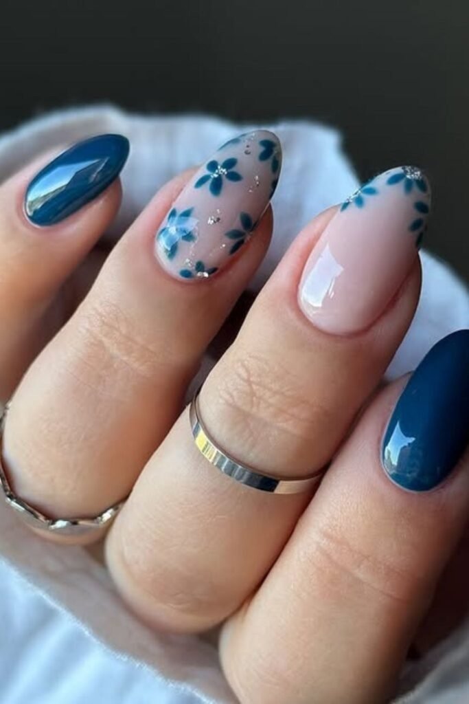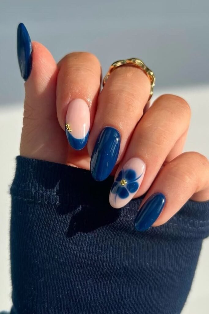Navy bloom accent nails focus on one or two nails with floral art over a deep blue base. The rest of the nails stay solid navy. The flowers are soft and slightly faded, not sharp or bright.