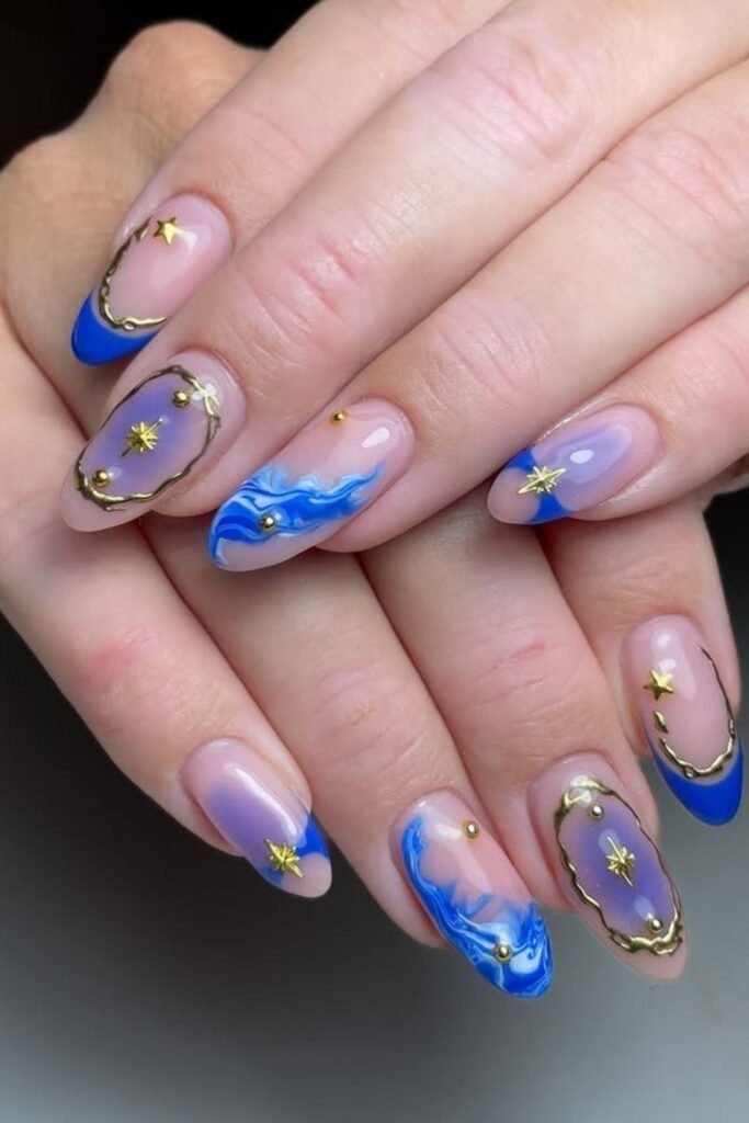 This look feels playful but still controlled. It works best with medium blues and navy tones. The key is keeping the stars subtle so the nails do not feel childish. This design is popular for winter and night events.