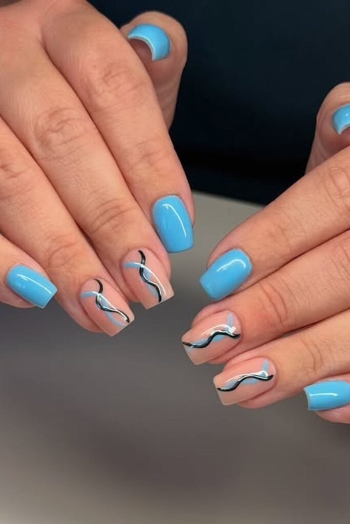 Wave line blue nails use flowing lines in different blue tones. The base is often nude or milky, while the lines move freely across the nail. No two nails look the same.