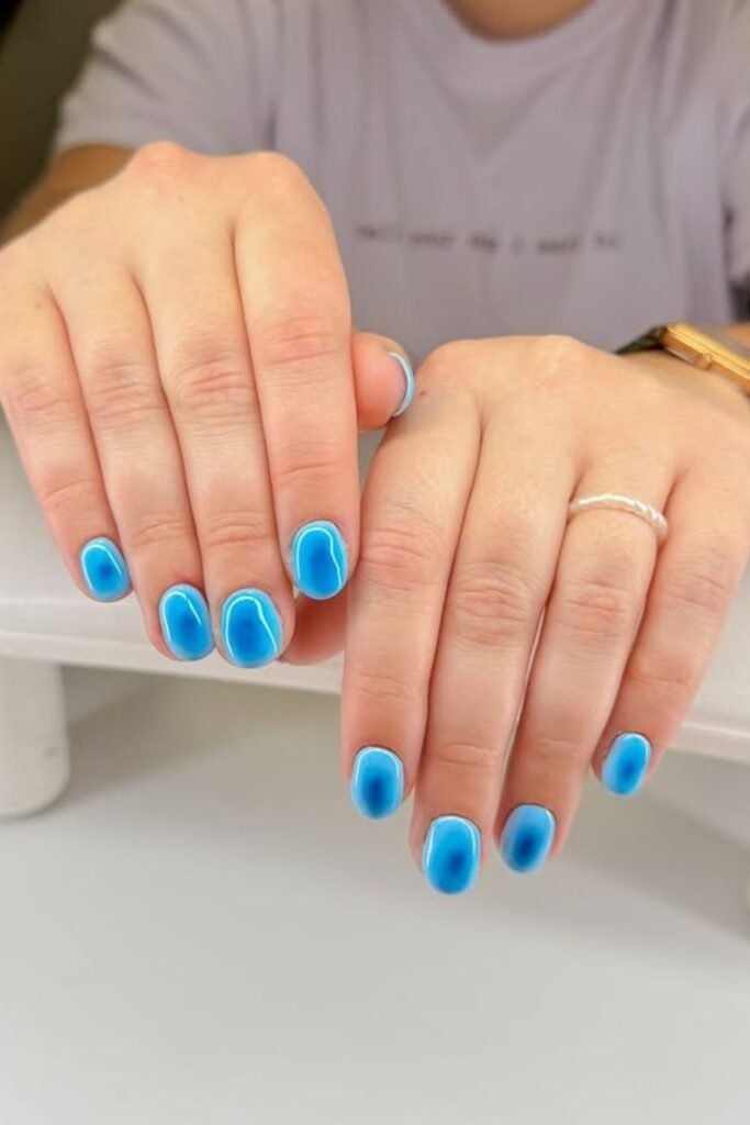 Pool water blue nails mimic the look of moving water. The blue has depth, with lighter and darker areas blended together. The finish is glossy, which enhances the effect.