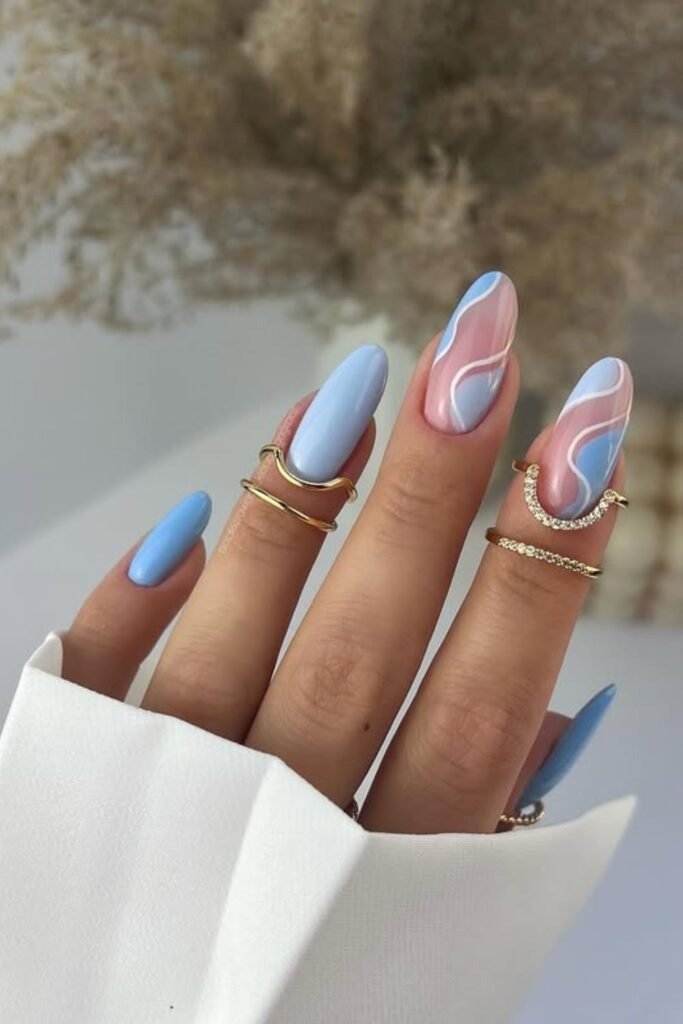 Pastel wave blend nails use soft blue mixed with other light tones like white or pale lavender. The colors flow together gently. There are no sharp lines.