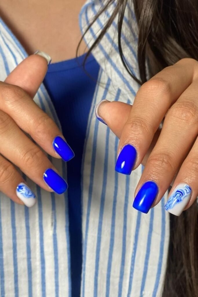 Electric cobalt nails are bold but controlled. The color is strong, but the design stays simple. Most sets are solid cobalt or use minimal tips.