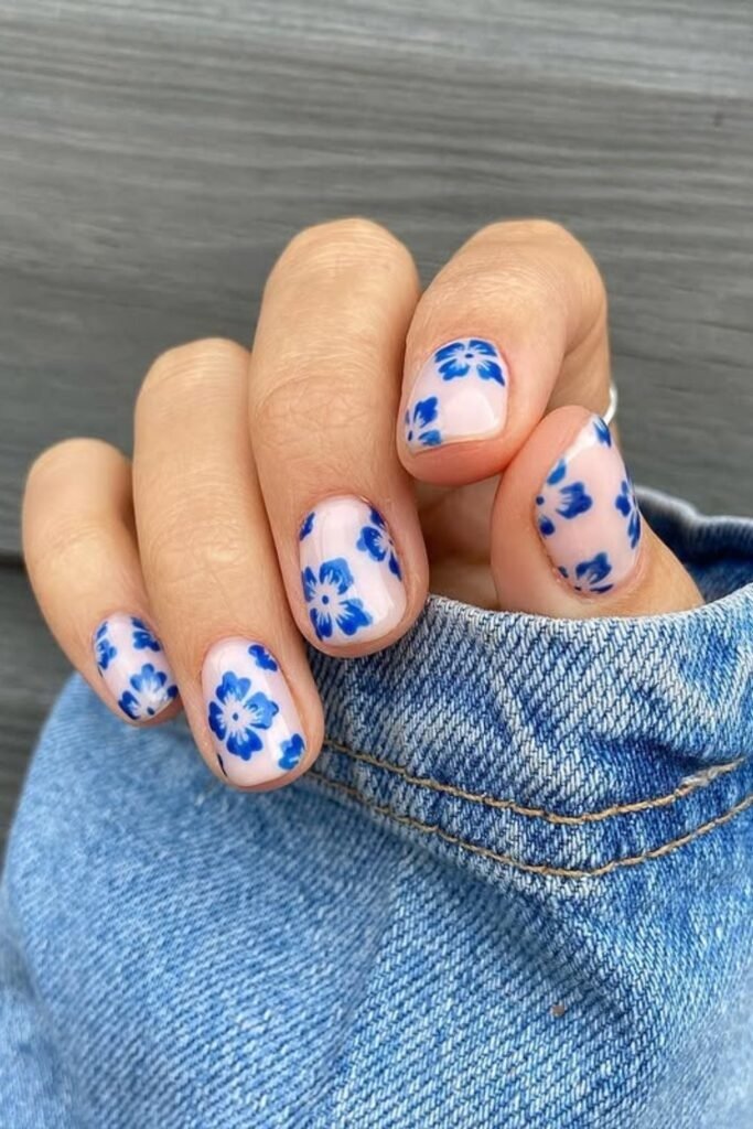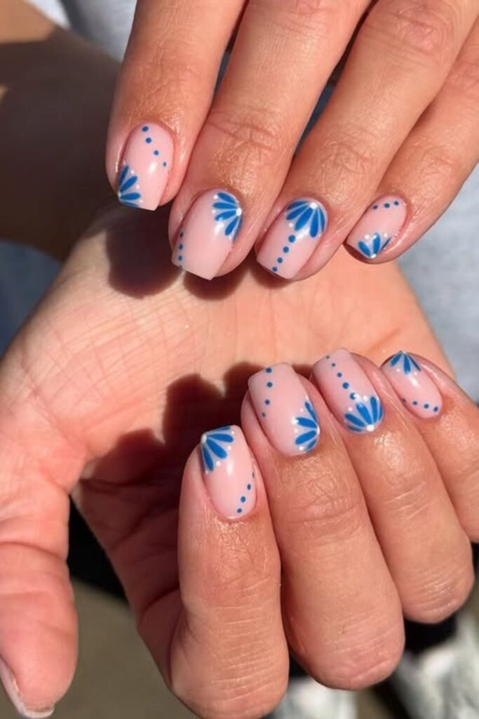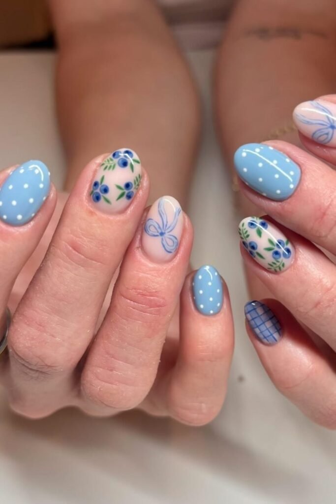 Cottagecore blue nails use soft blue shades with tiny floral or dot details. The base stays light, and the art feels hand-painted. Nothing looks sharp or perfect.