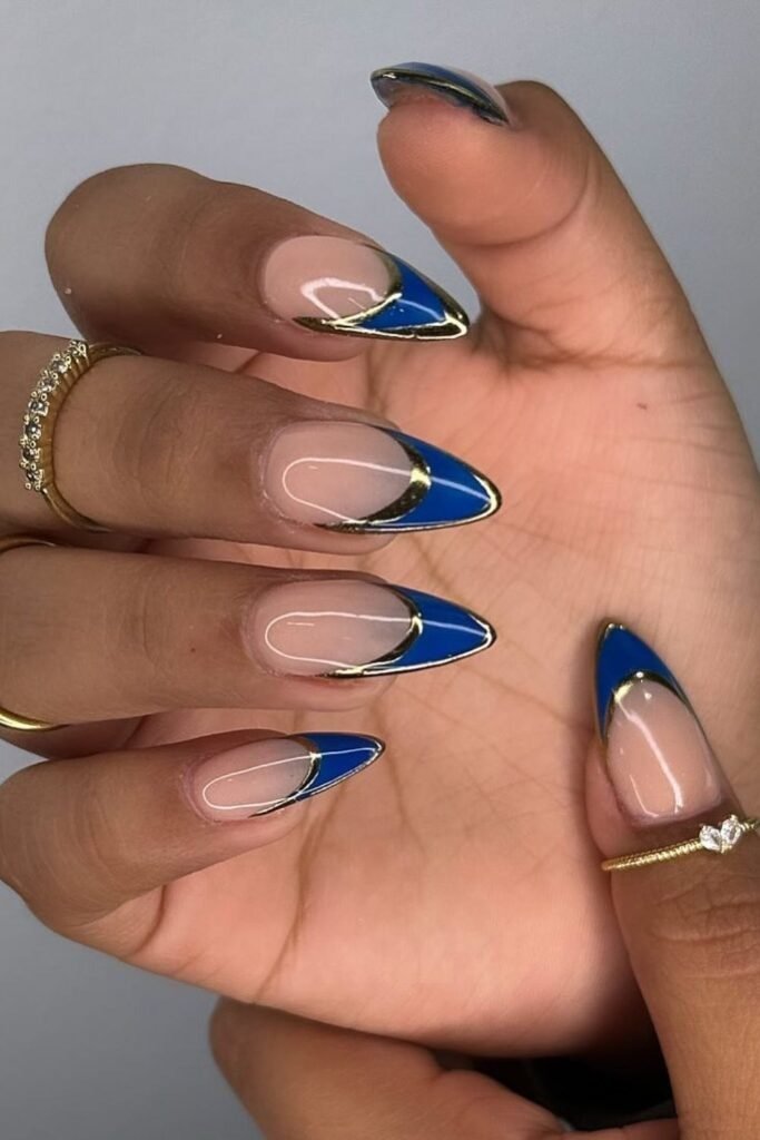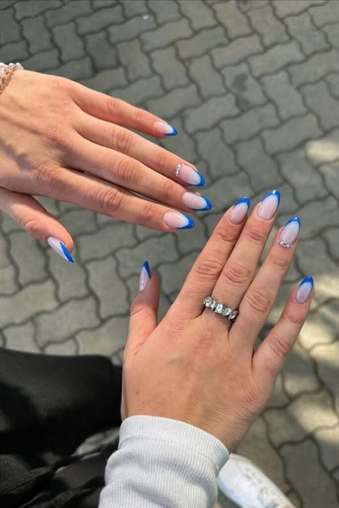 Royal edge tips use deep royal blue on sharp or defined tips. The base stays nude or sheer. The line between base and tip is clean.