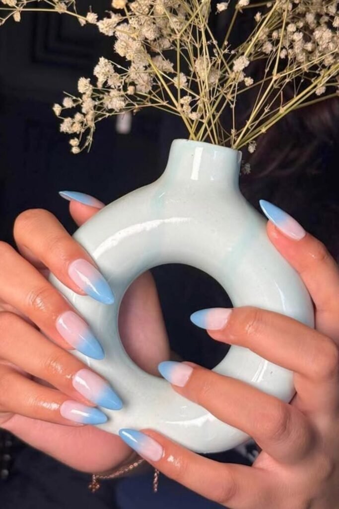 Frost tip almond nails combine soft blue tips with a light frosted finish. The base remains natural, and the blue fades gently at the tip. The frosted look adds a soft blur, not sparkle.