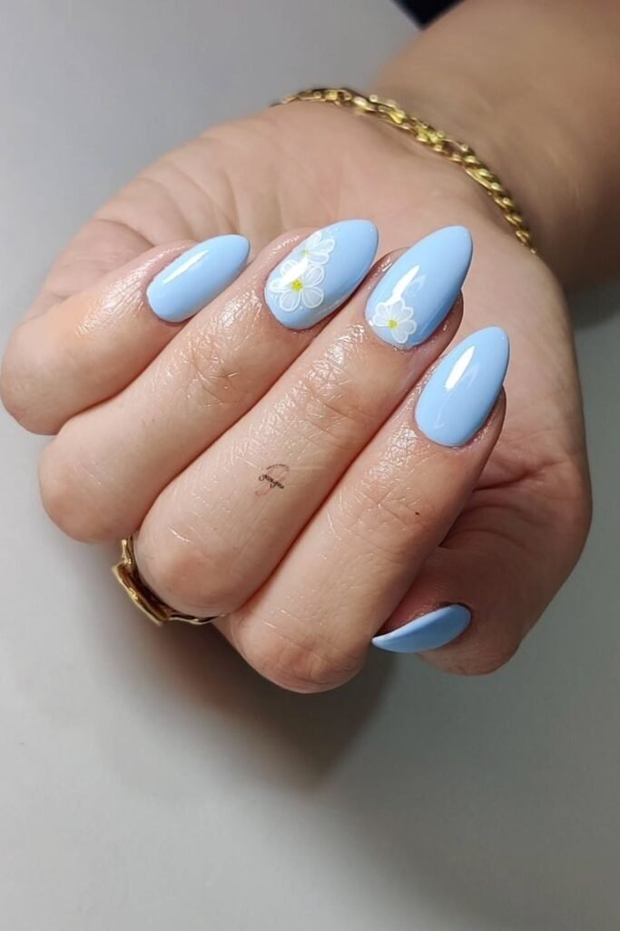 Baby blue daisy nails use a light blue base with small white daisies. The flowers are simple and spaced out.