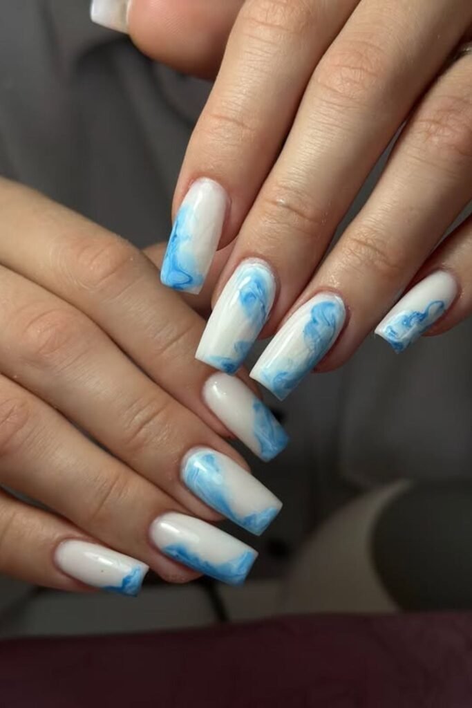 Ocean marble blue nails blend multiple blue shades with white to create a stone-like effect. The flow is smooth and natural.