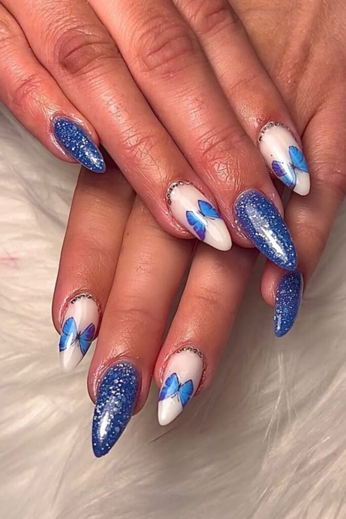 Sparkling butterfly blue nails feature soft butterfly shapes with light shine. The sparkle is fine and controlled.