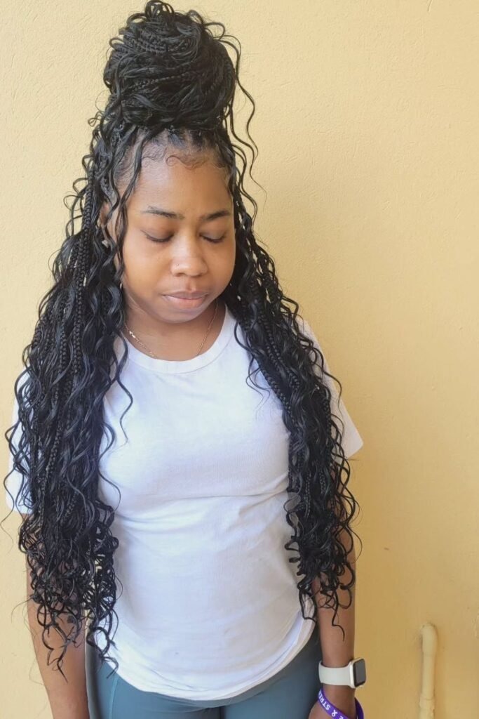 This hairstyle is good for hot weather or active days. The bun keeps hair secure, and the curls stop it from looking too tight. The scalp feels light because the braids are knotless, even when tied up.