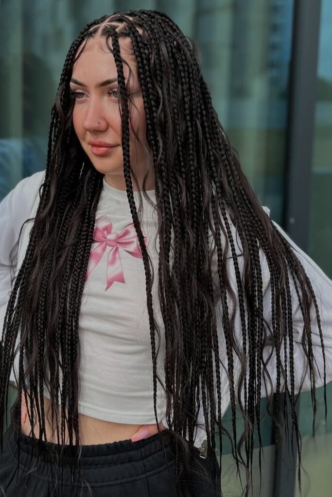 Extra-long knotless flow is for those who love drama in a calm way. The braids are thin and long, with curls flowing through the length. The hair moves with every step.