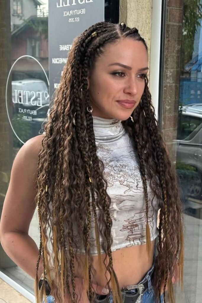 Long boho curls are a favorite for people who love length with flow. The braids run down the head in neat rows, while long curls fall between them. The curls soften the look and stop it from feeling stiff.