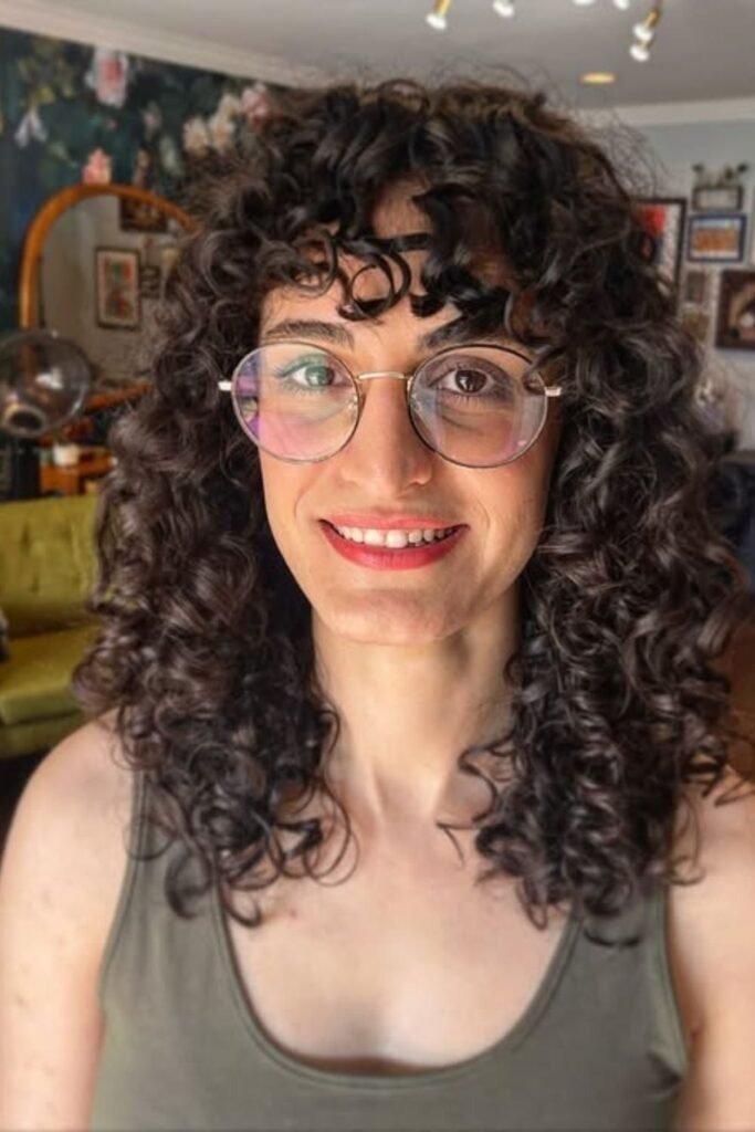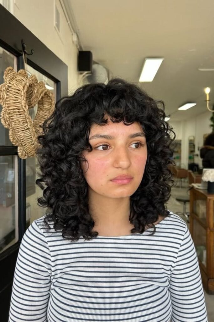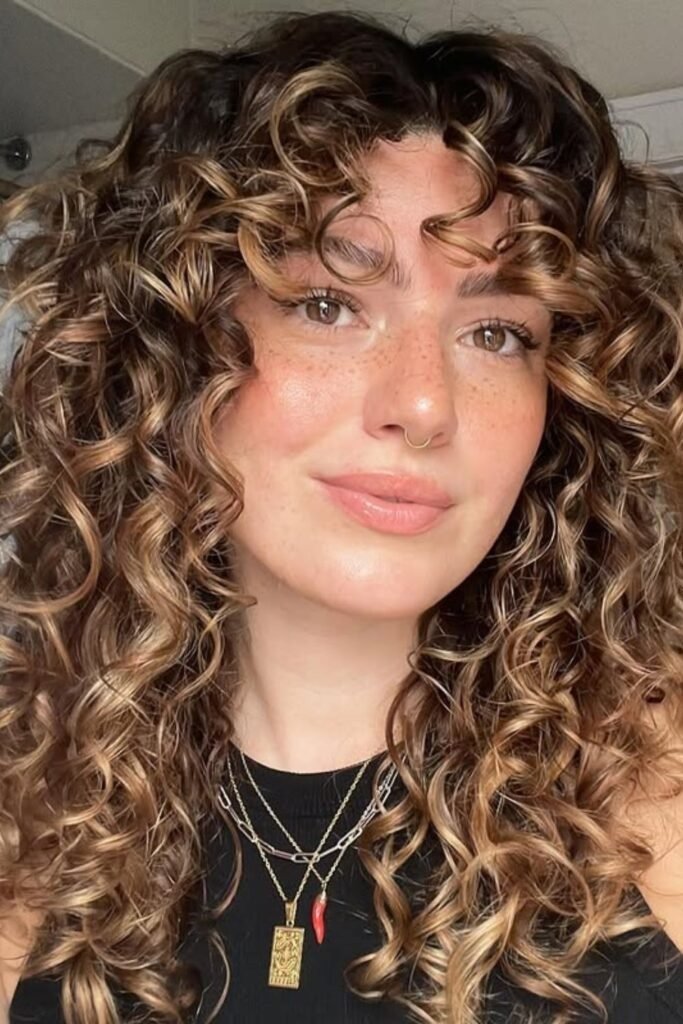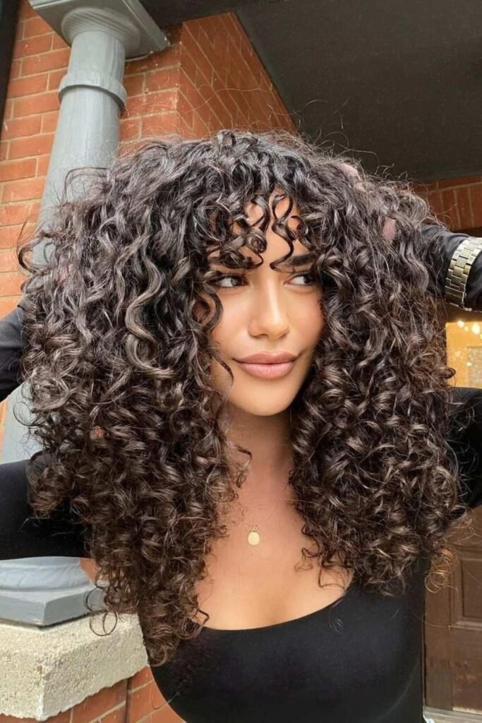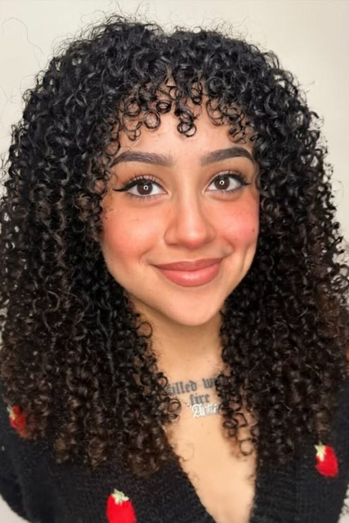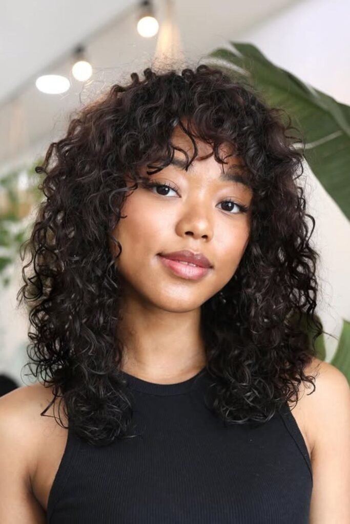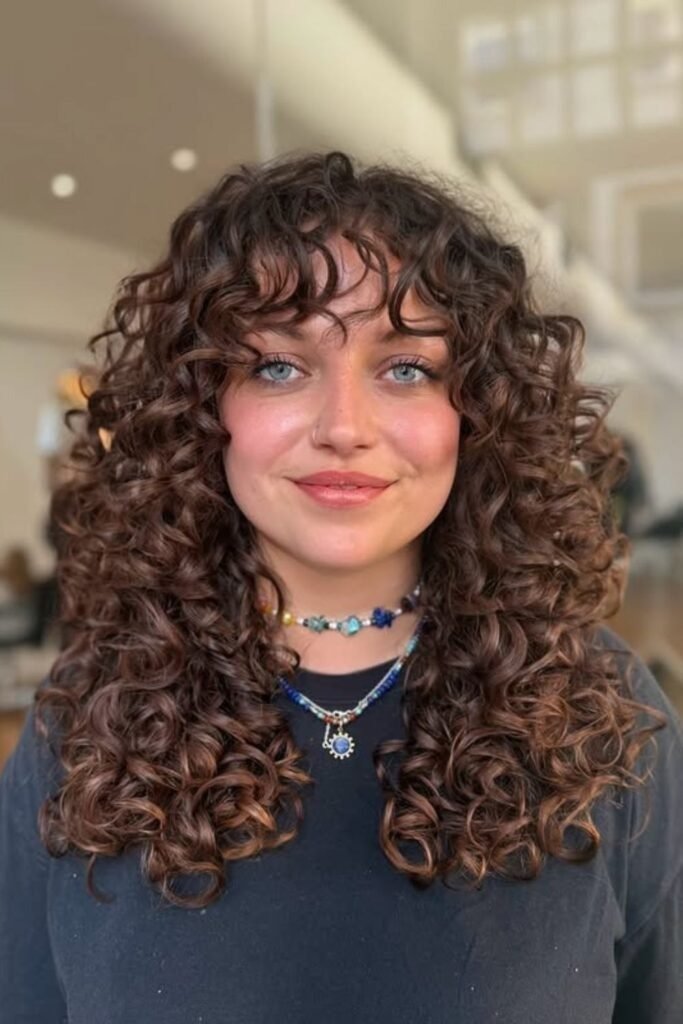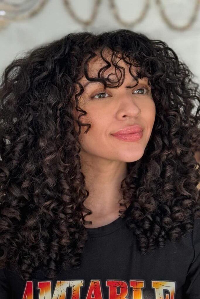 With medium to long curly hair, layered bangs blend smoothly into the rest of the curls. This style adapts well to different curl days.