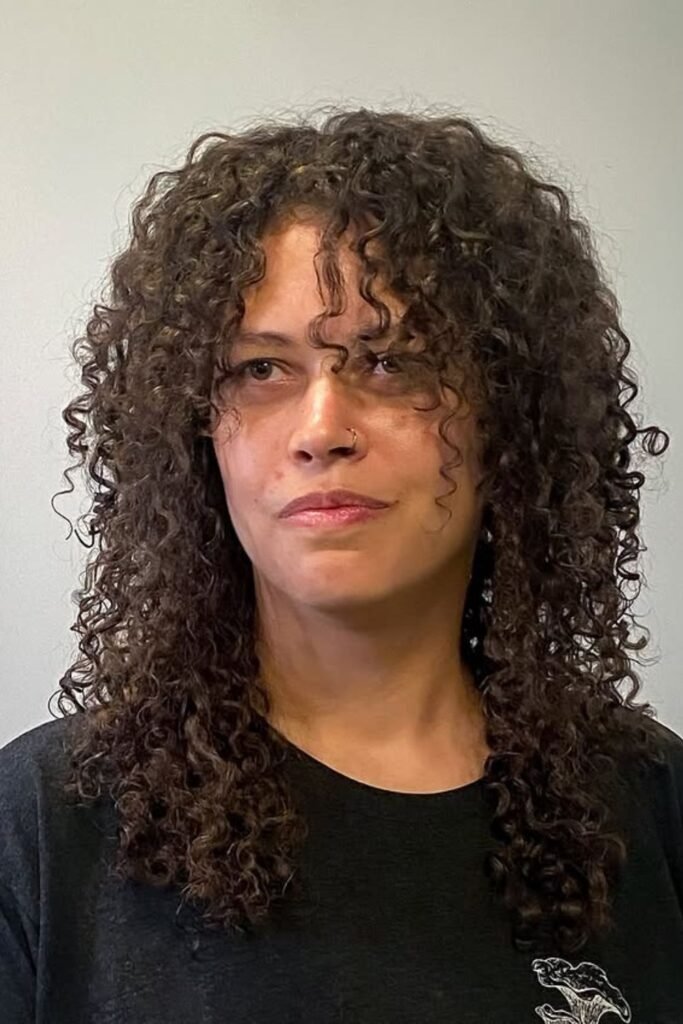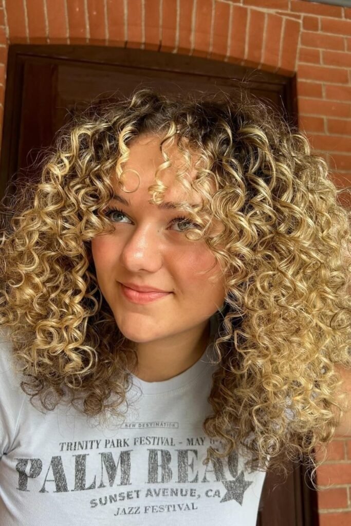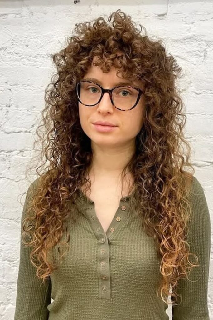 With longer curls, wispy bangs add detail without bulk. They move freely and grow out well. This style works best when kept clean and lightly styled.