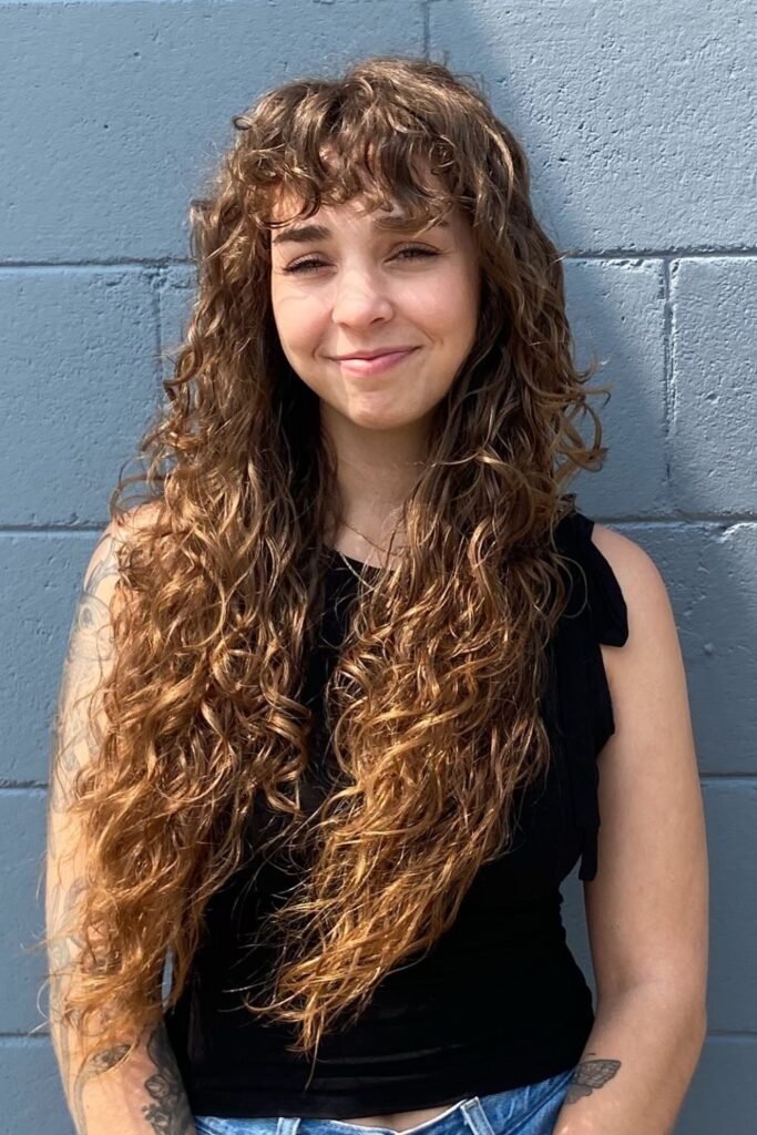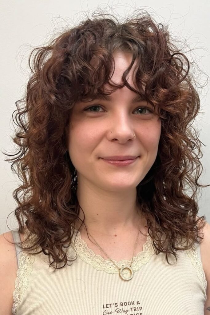 A soft shag pairs curly bangs with layers throughout the hair. The bangs blend into the shag shape, creating movement and texture.