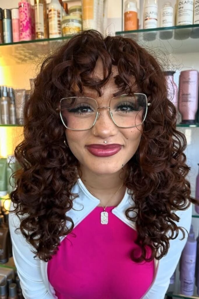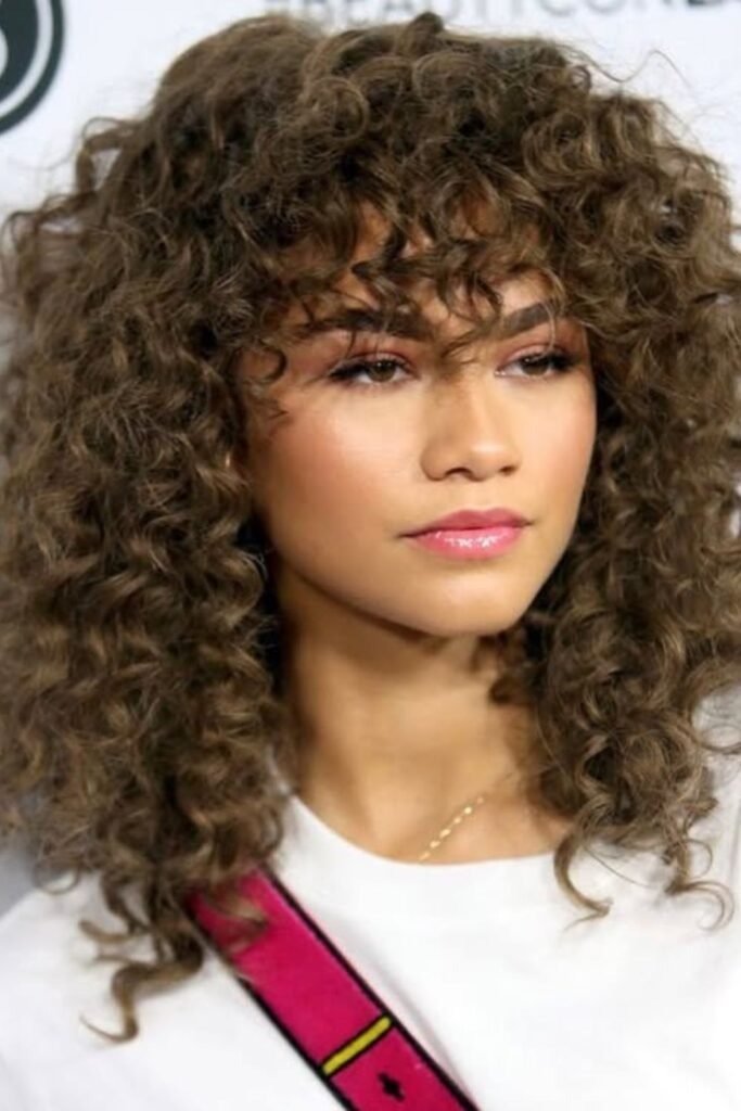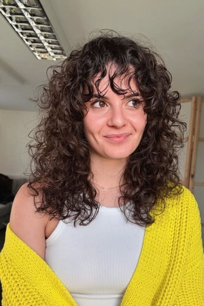 With medium to long curls, a curly fringe adds balance and keeps the face from feeling too open. It works best when the rest of the hair has layers to support the volume. Styling stays simple when curls are allowed to form freely.