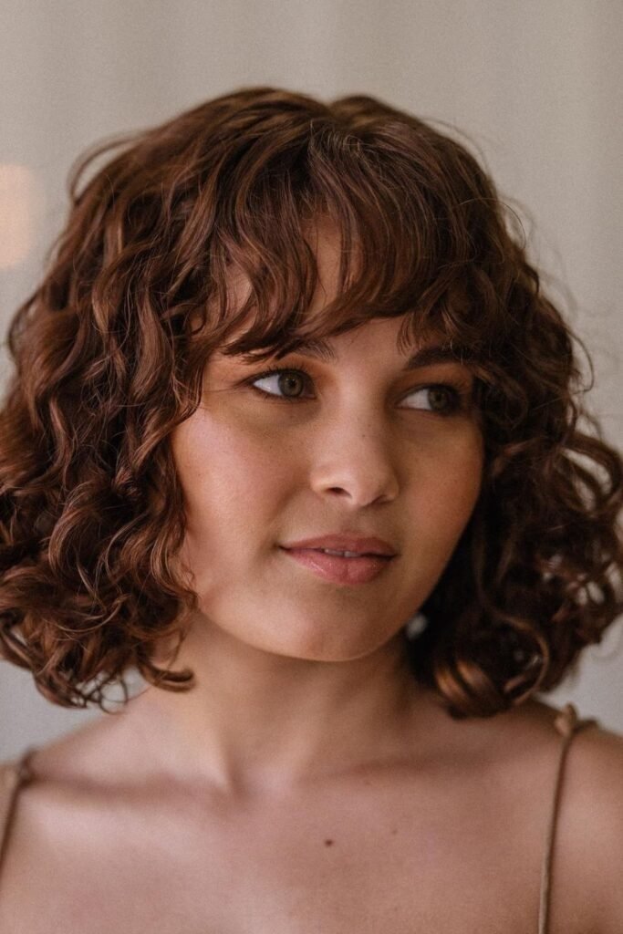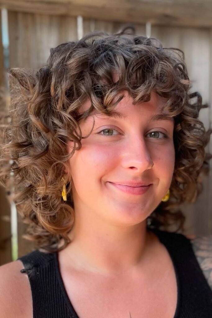 A curly bob with bangs creates a compact, balanced shape. The bangs help anchor the style and define the face.