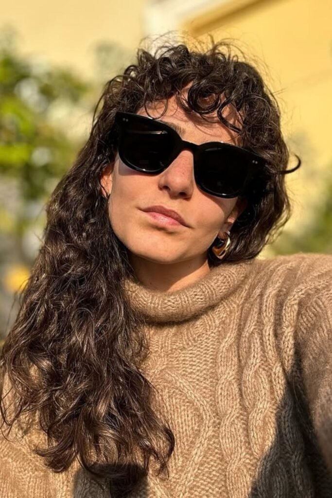 The curly mullet combines short bangs with length in the back. The bangs are curly and full of character.