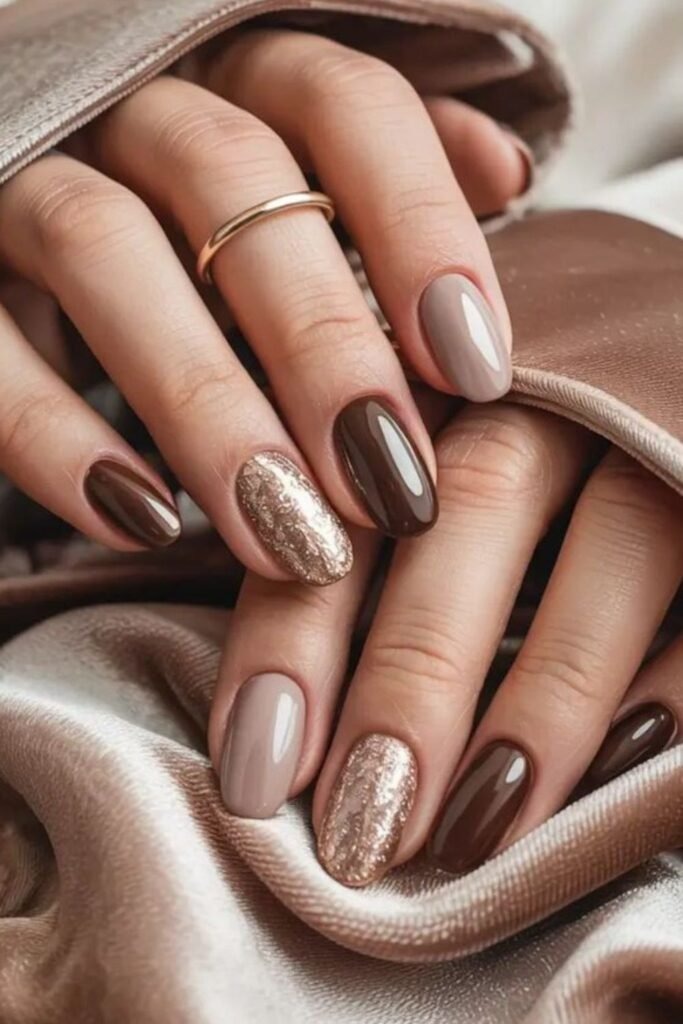 Mocha sparkle blend nails mix soft brown polish with gentle shine. The sparkle is light, never sharp. This design works well for people who want something simple but not plain. It fits office days and dinner nights with ease. The brown base keeps it grounded while the shine adds life. This style also grows out well, which makes it practical for fall routines.