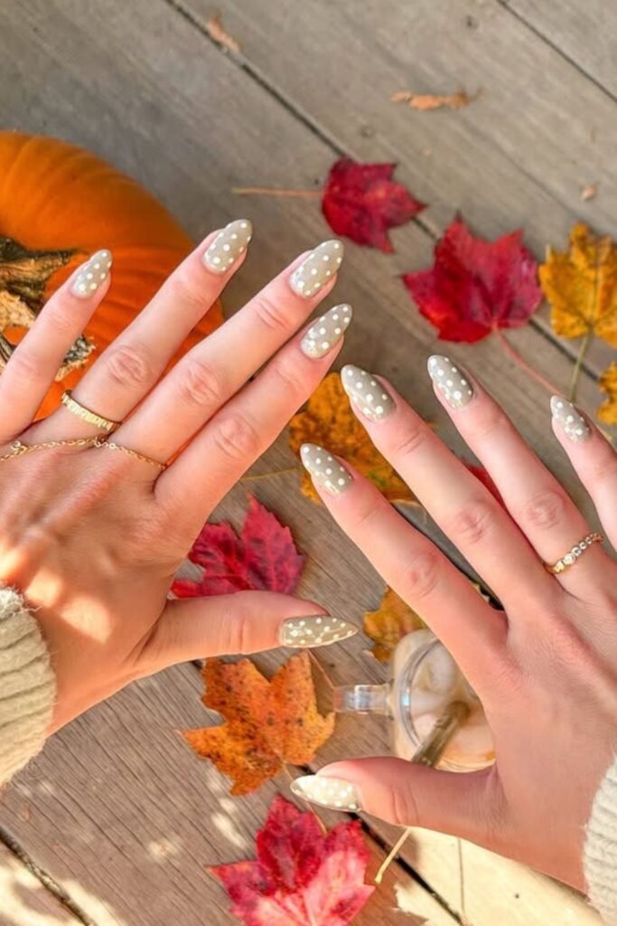 Cozy dot neutrals use warm nude shades with tiny dot details. The dots add charm without making the nails busy. This look feels calm and friendly. It suits short nails very well and works on all ages. The design feels handmade, which is a big reason it fits fall so well.