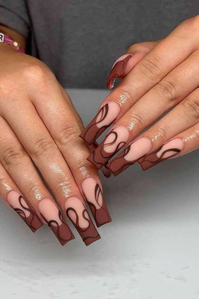 Chocolate swirl art nails use rich brown shades twisted together in soft curves. The look feels smooth and warm, like melted chocolate. No sharp lines are used. Each nail looks slightly different, which adds beauty. This design pairs well with knitwear and soft fabrics.