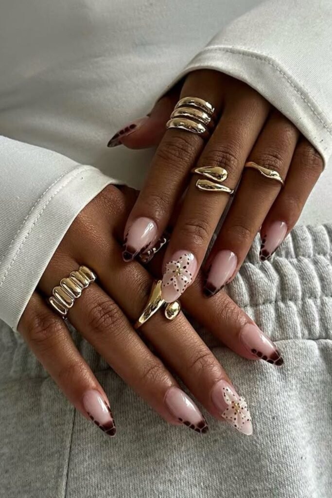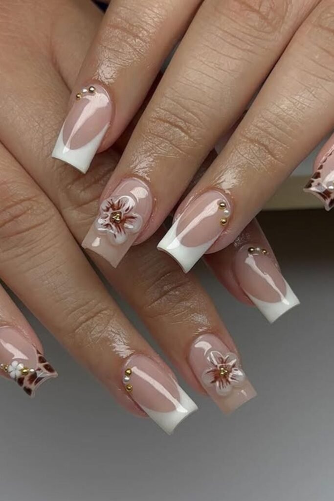Floral French elegance nails add small flower art to a French base. The flowers use fall colors like brown, cream, and soft gold. The design feels gentle and clean. It works well for formal and casual settings.