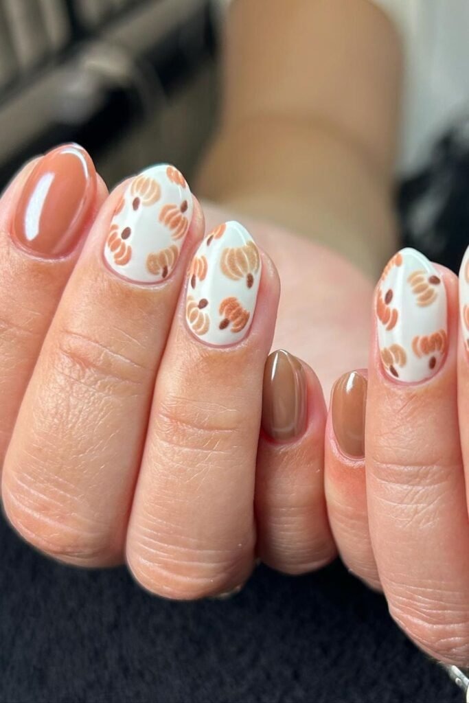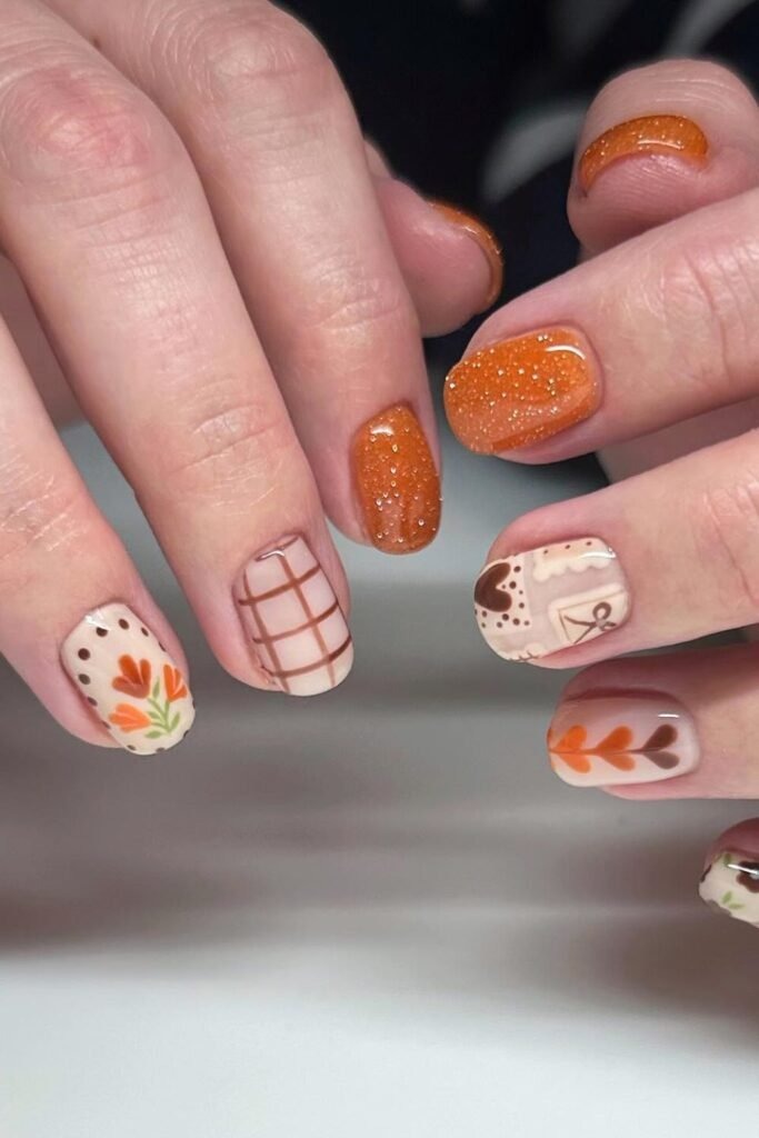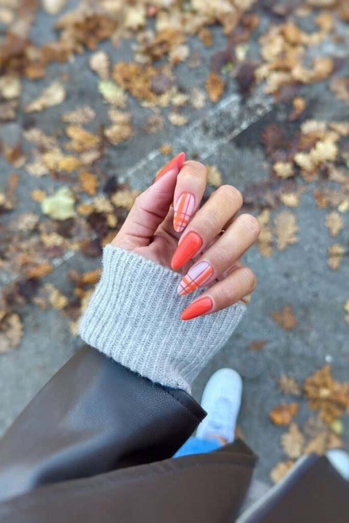 Pumpkin plaid vibes mix orange-brown tones with soft plaid lines. The pattern feels cozy and seasonal without looking childish. The colors stay muted, which keeps the design mature. This style works best on medium-length nails.