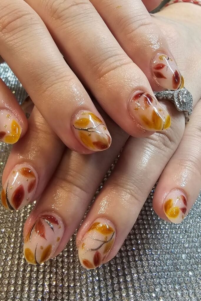 Autumn leaf art nails feature hand-drawn leaf shapes in brown, gold, or rust tones. The art stays simple, often placed on one or two nails only. This design feels thoughtful and calm. It brings fall imagery without being too literal.