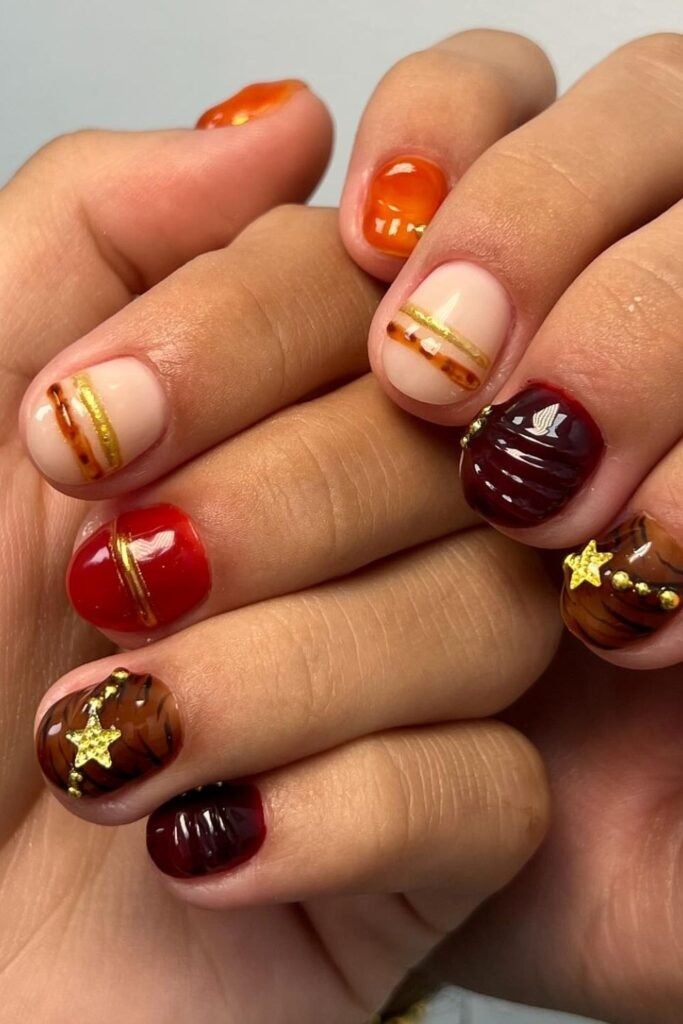 Glossy fall medley nails combine several fall colors with a high-shine finish. The colors stay solid, not patterned. This look suits people who love color but want a clean finish. The gloss adds depth and keeps the nails looking fresh.