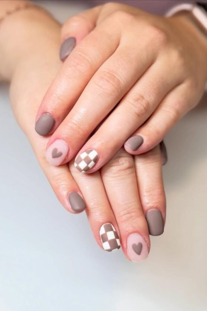 Mocha checker hearts mix soft brown checks with small heart details. The design feels warm and playful but still grown. The hearts stay small and subtle. This look works well for casual fall days and relaxed outfits.