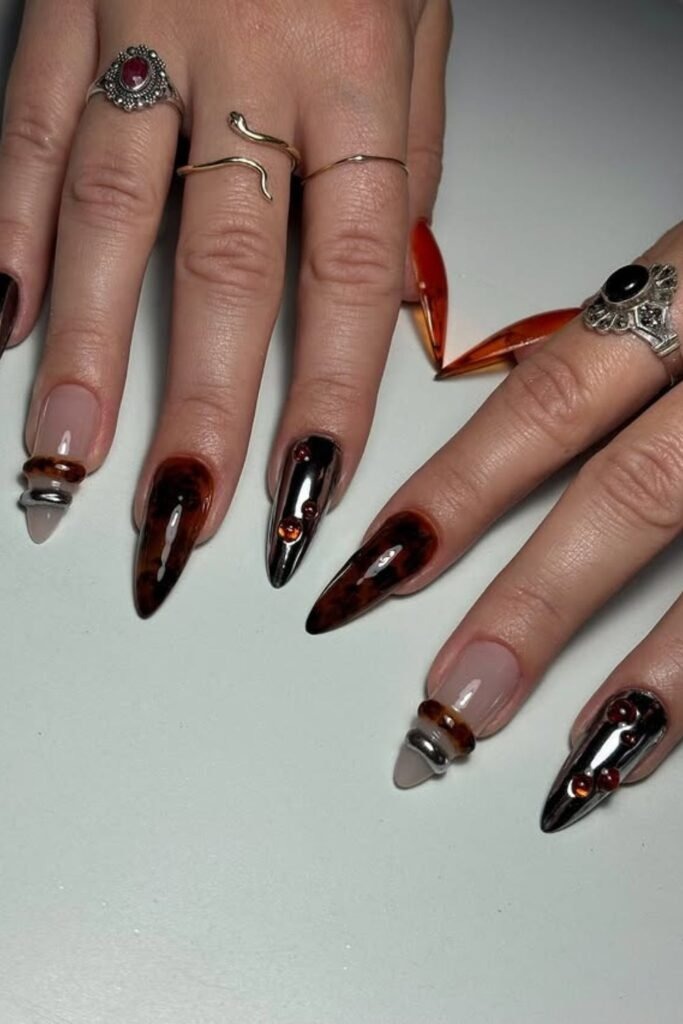 Chrome ember tips use deep warm tones with a soft chrome finish at the tips. The shine looks like glowing embers, not bright metal. This design feels modern but cozy. It is a good choice for evening wear in fall.