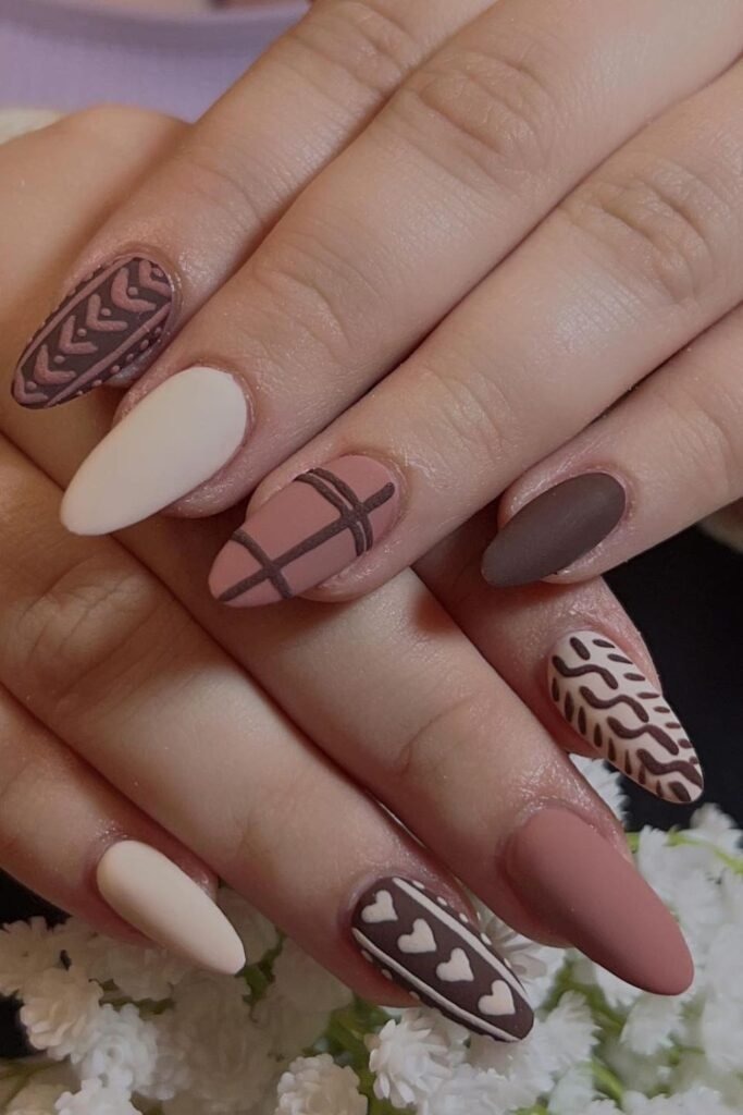 Cozy sweater set nails use raised patterns that look like knit fabric. The colors stay neutral, often cream or soft brown. The texture adds interest without color overload. This design feels perfect for cold mornings and warm drinks.