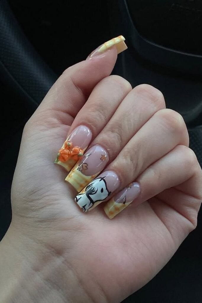 Snoopy fall French nails add a small character detail to a classic French base. The art stays tiny and neat. The rest of the nail stays clean. This style feels playful but still tidy, making it popular with younger and older wearers alike.