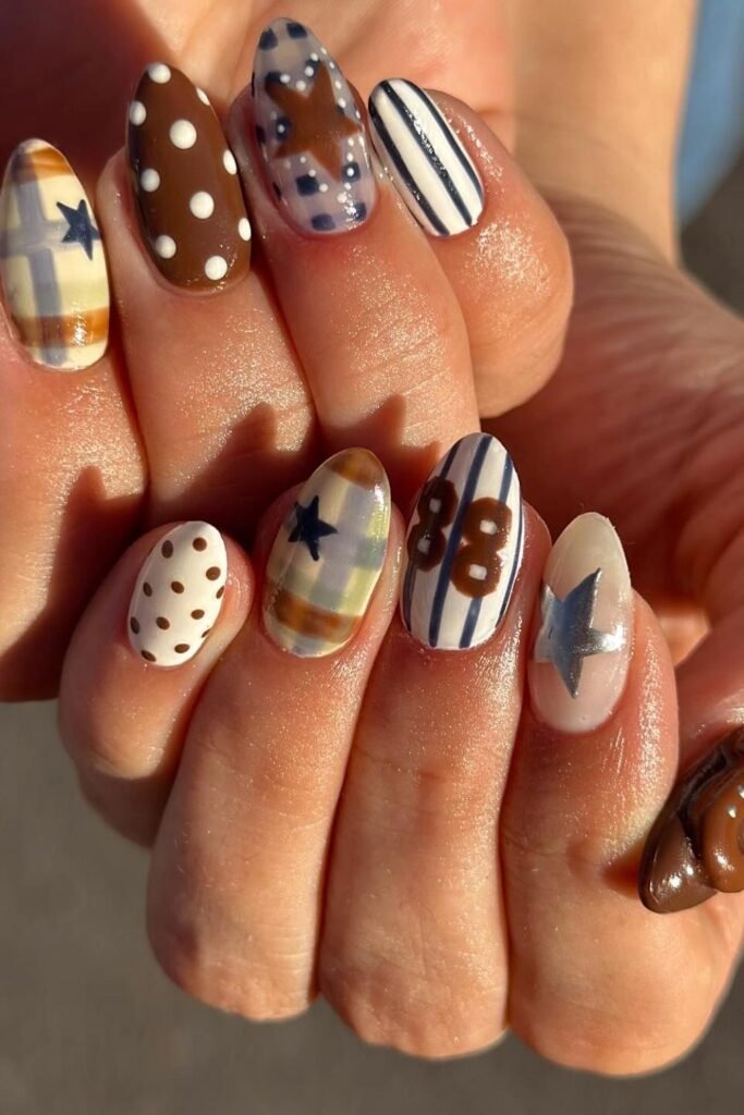 Rustic star plaid nails mix plaid lines with small star shapes. The colors stay earthy and soft. This design feels handmade and cozy. It works best when the art stays light and balanced.