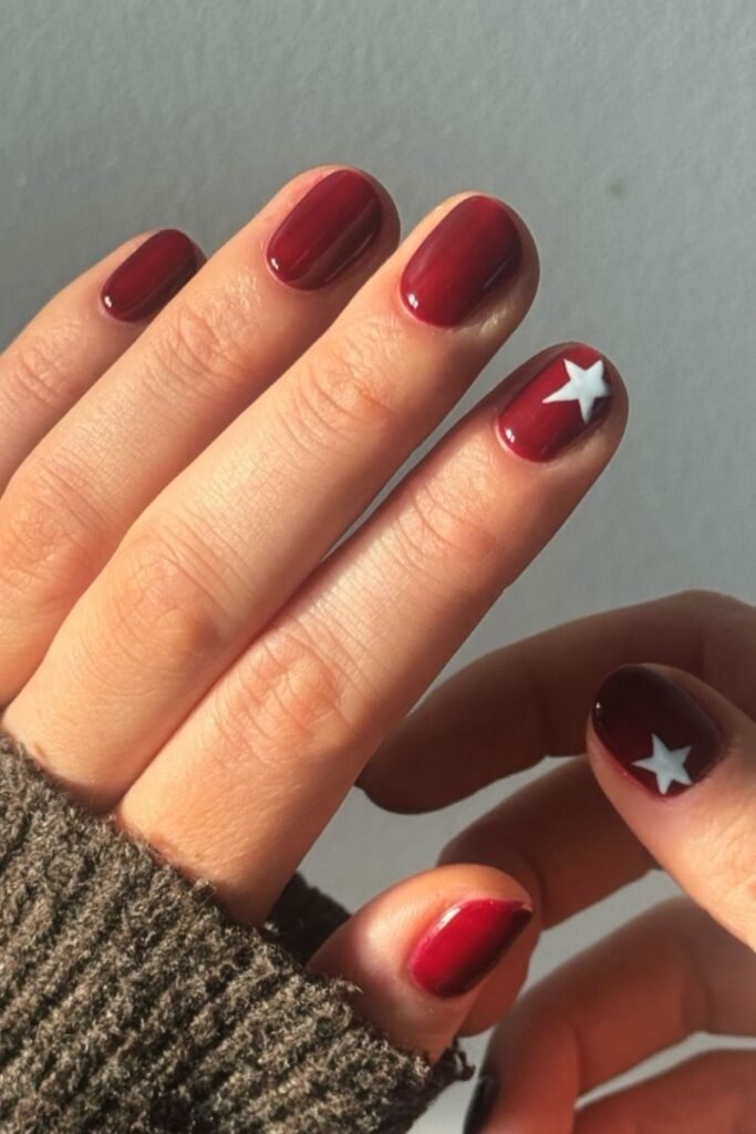 Starry burgundy shine nails use deep red polish with tiny star details. The shine stays smooth and even. This look feels rich and calm. It suits fall nights and special events without feeling too bold.